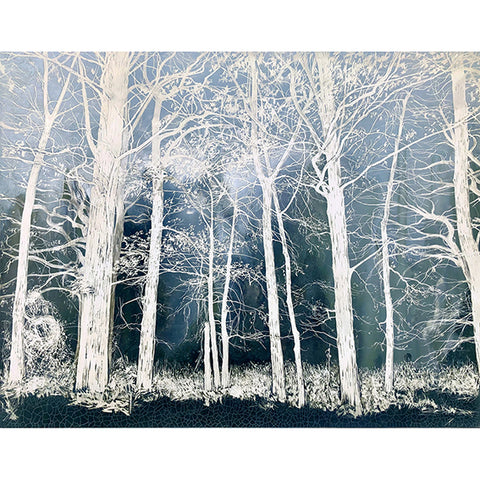 My practice is constantly evolving; experimenting with different mediums and surfaces, adding multiple layers of paint or scraping back into those layers to create texture and depth. This technique is very distinctive in the ‘Found Forest’ series. This current work is very detailed and photographic, with a limited colour palette. The aim is to capture the stillness, light and atmosphere of the landscape, frozen in that moment. Bringing it to the highest level of expression.’