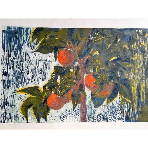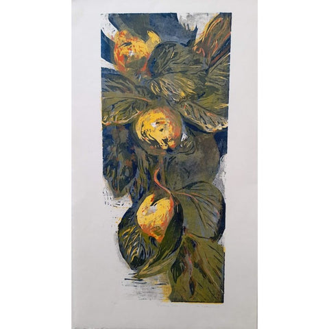 Hilary studied painting at the Slade School of Fine Art and printmaking at Chelsea School of Art. Awarded the Prix de Rome scholarship and scholarships to Greece and Spain; her Mediterranean-influenced subjects include allegorical figures and still lifes of fruit and flowers. Her woodcuts are drawn from life and hand printed on Japanese paper, one wood block for each colour, creating rich overlays of colour.