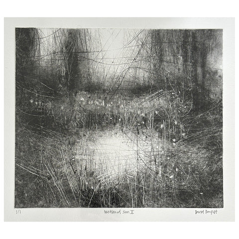 The monoprints are a totally different way of working to watercolour where removing colour allows him to concentrate on tone, extreme contrast and mark making. These elements are revealed in the wiping of ink from the plate and by marking and drawing on the plate itself. There is a mechanical process to it all which David finds therapeutic.