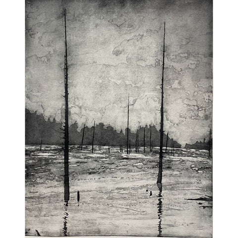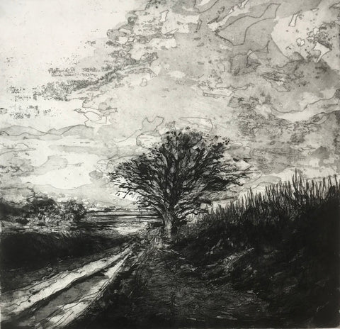 The language of traditional etching has unique eloquence for Mary. Interweaving this alchemical process with the layers and symbols inherent in the landscape feels to her the most robust way of exploring a complex world of overwhelming emotions. Her work has been described as conveying “powerful, uncompromising landscapes” pervaded by a “stern lyricism which speaks beyond place and season”.