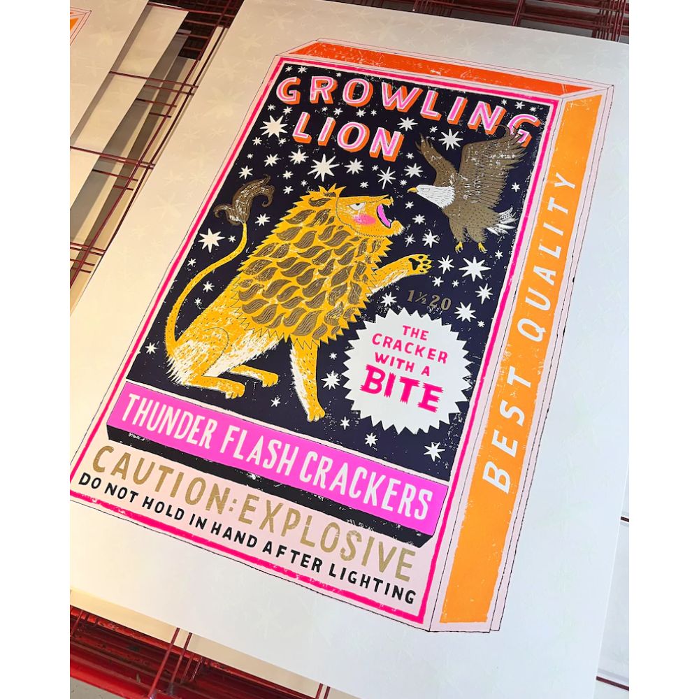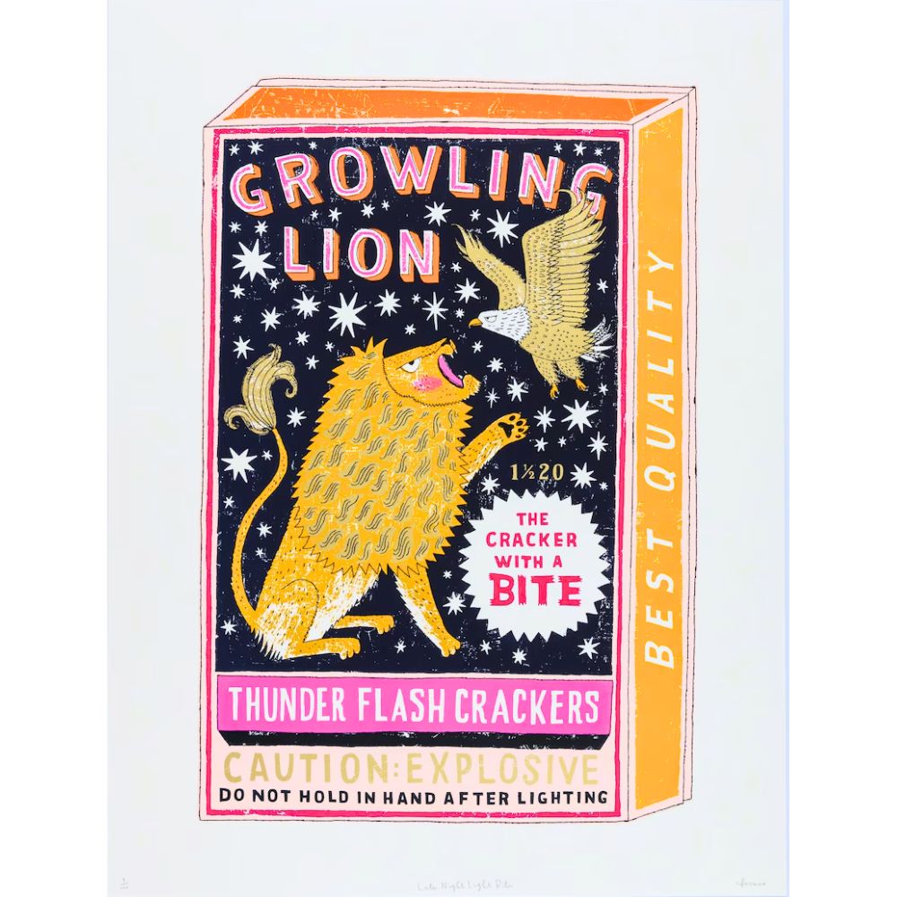 A handmade screen print featuring a quite angry looking tiger, he's growling in the face of an equally hostile looking eagle. They probably both need an early night - it's loosely based on a vintage fire cracker box. ...oh and there’s a slightly secret layer of pearlescent glow in the dark stars.