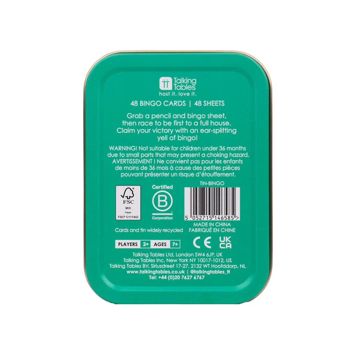Everyone enjoys a lively game of bingo, and with our Fun in a Tin Bingo you can take this classic game anywhere in your pocket. Inside are 48 bingo sheets and number cards from 1 to 48. Each player just needs to grab a pencil and race to complete a full house before anyone else shouts BINGO! This game is plastic-free and reusable, offering easy entertainment for parties or evenings together with the family.