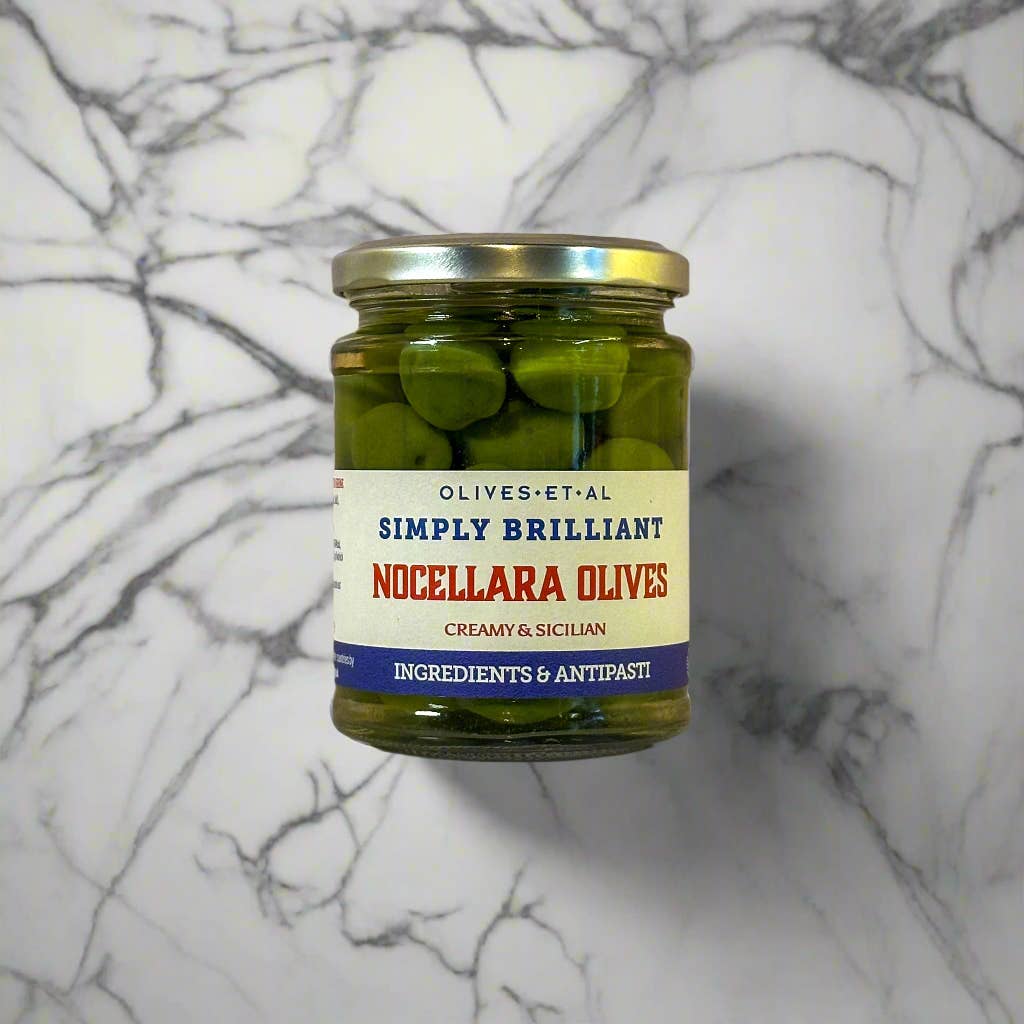 Sicilian Nocellara del Belice Olives in a light brine. Buttery, creamy & sweetly firm, these are the classic Sicilian Olives — perfect to eat just as they are, in a crisp salad, or in a Martini.