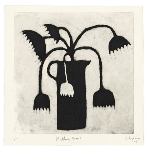Eska Marsh is a British contemporary artist based in Bristol, UK. Primarily working with drypoint and carborundum, Eska draws inspiration from American folk art, still life’s and everyday objects to create her monochromatic prints. Even when depicting small objects, Eska’s compositions make them appear monumental and weighty, emphasizing their form and silhouette.