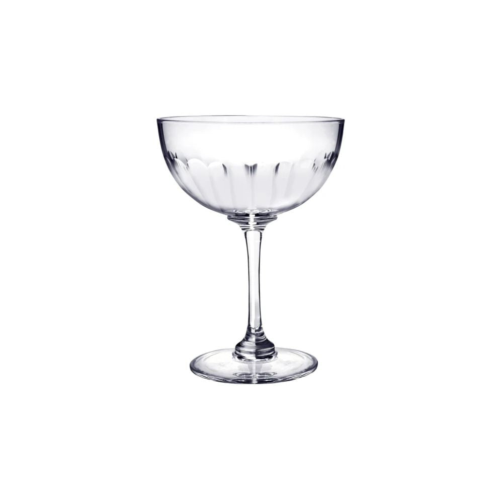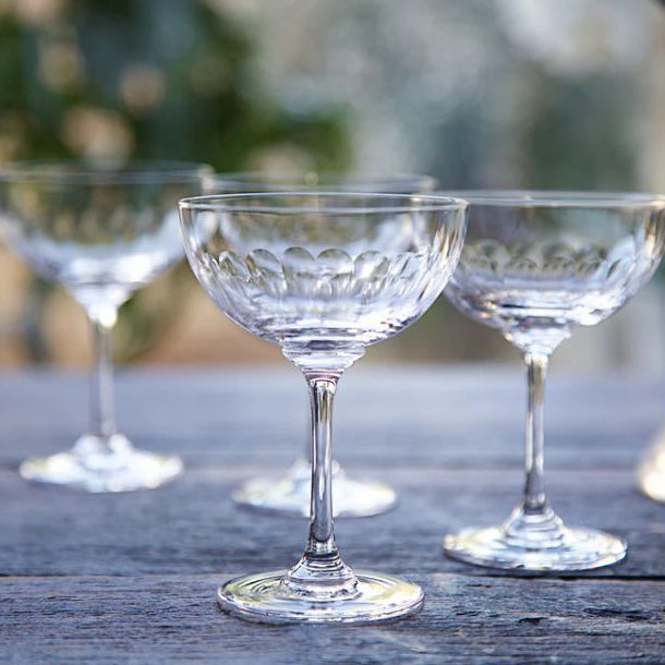 A delicate crystal glass, champagne saucer created in the style of 19th century English design. These glasses features a beautiful etched design around. Hand engraved, each glass is unique and the perfect size for serving cocktails or champagne.