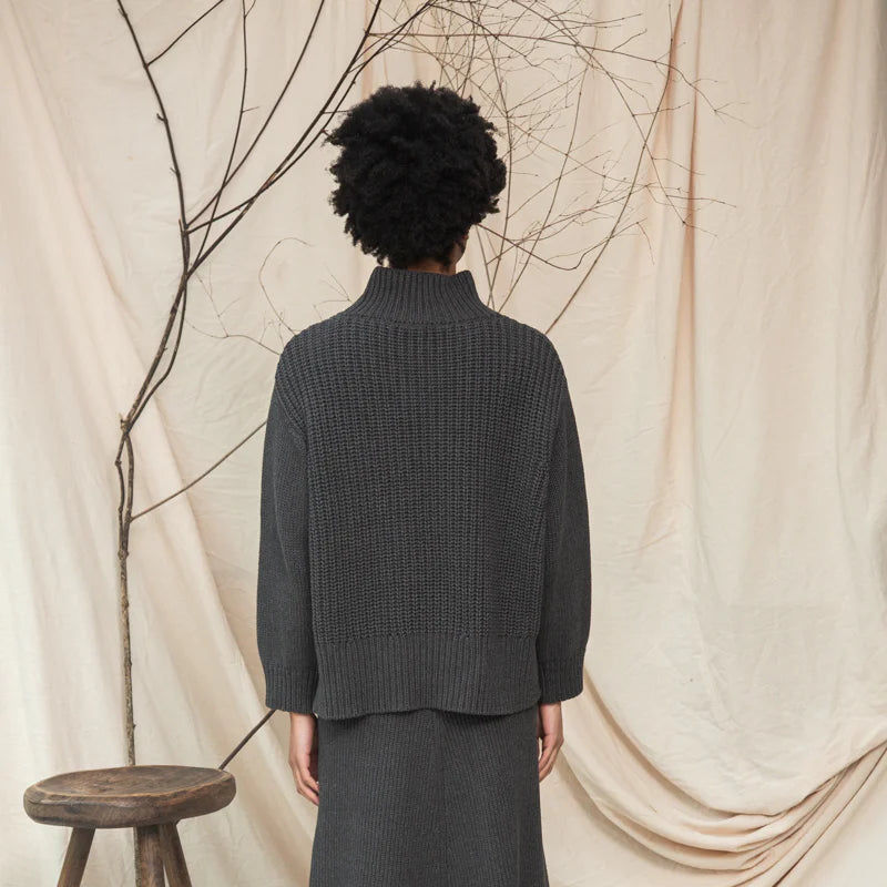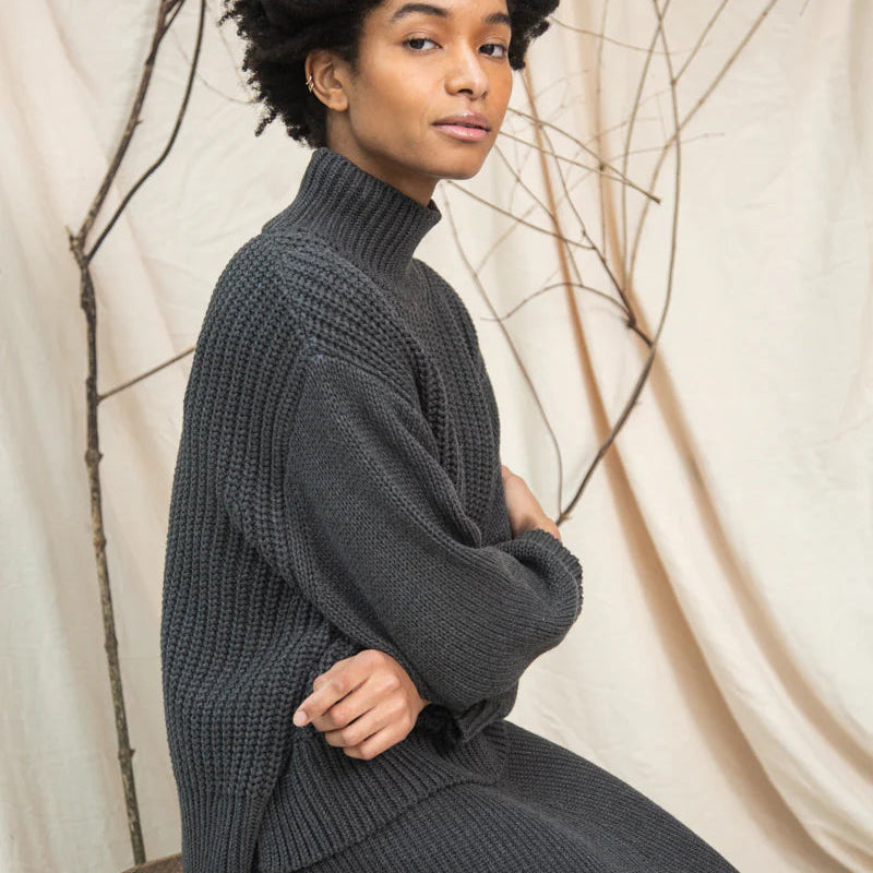 The Tora jumper is a loose fit, comfortable style made from ribbed organic cotton featuring a funnel neck.