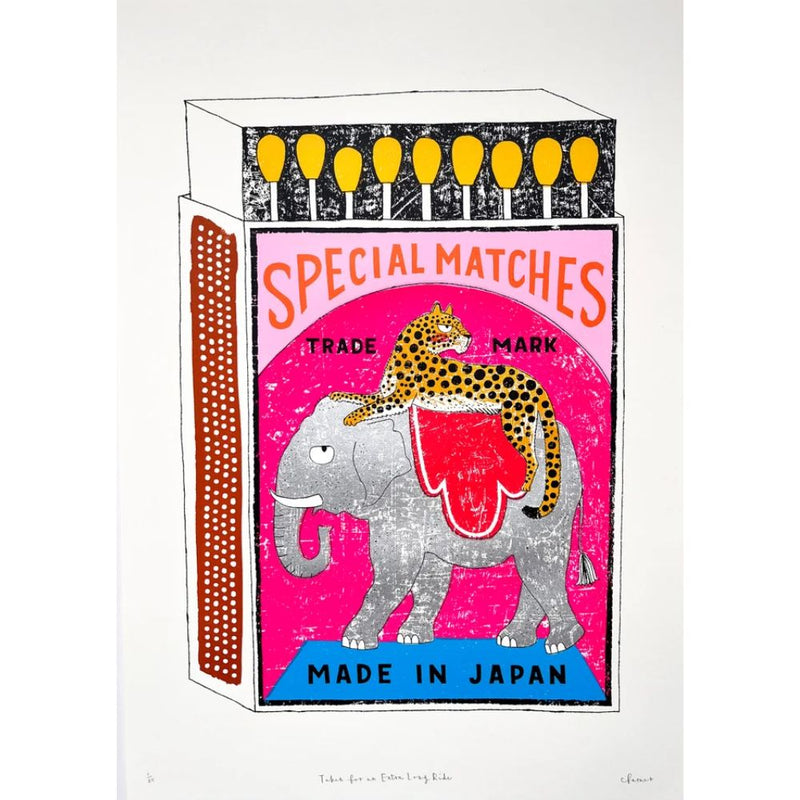 A handmade screen print of a leopard lounging on the back of a slightly bemused silver elephant - all on an illustrated matchbox.