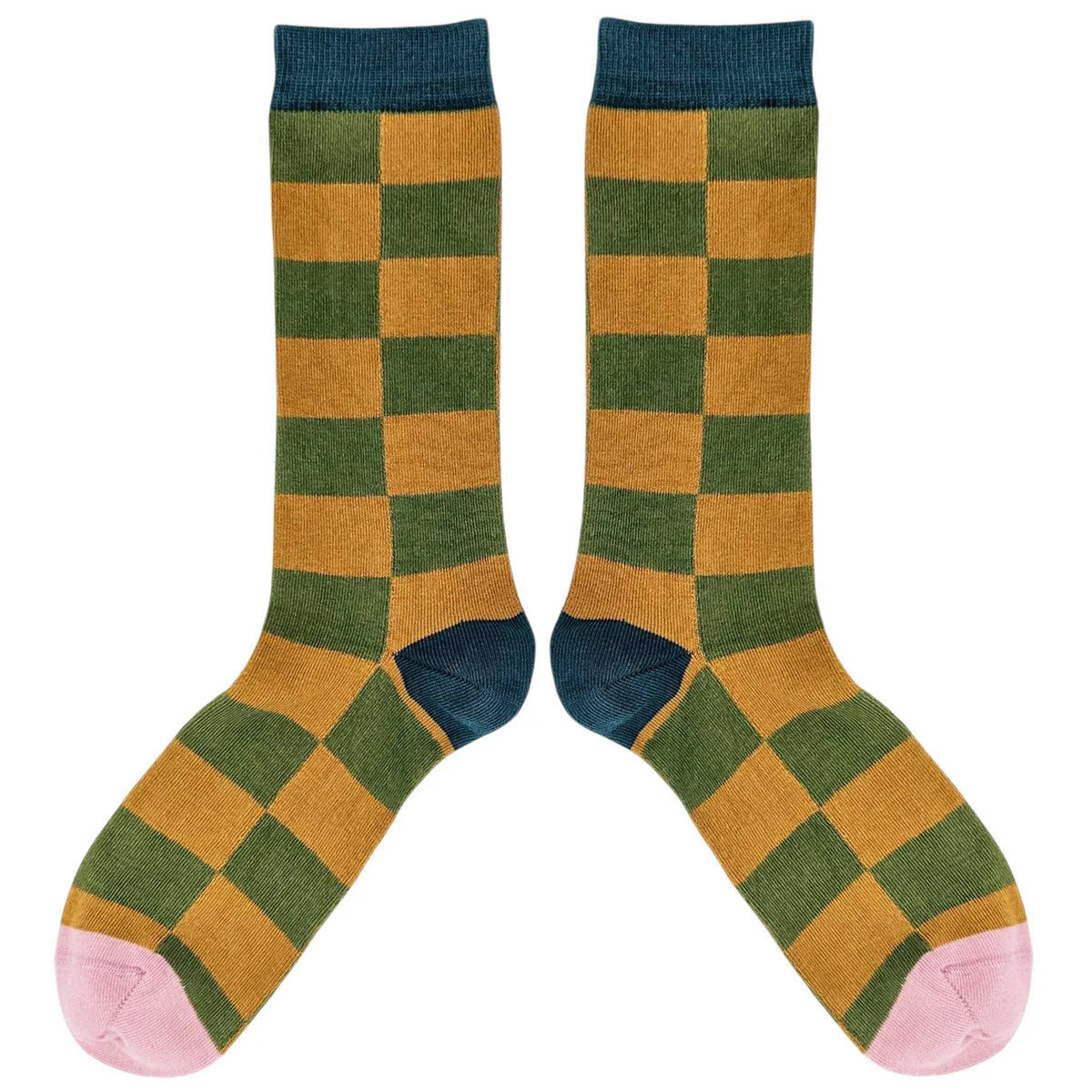 The pattern features a green & mustard battenburg check, framed with navy trim, and heels with dusky pink toes.